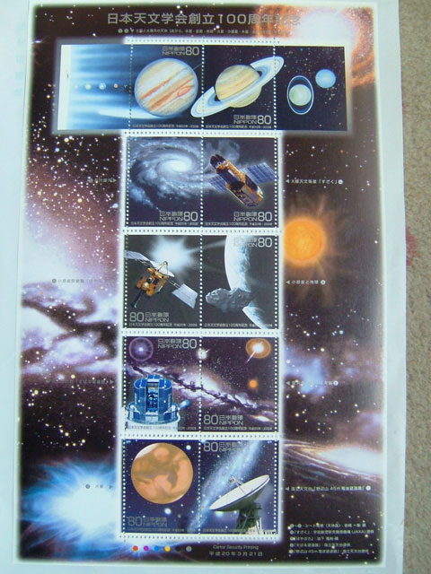 日本天文学会(明治41(1908)年1月に創立され、わが国や世界の天文学の展開を支え、天文学の社会への普及に寄与している団体)創立100年を記念して記念切手が発行されました。 ちょっと変わった記念切手(切手とその周りに台紙がある珍しい切手) 発売は21日でしたが、今日でもありましたので、いかがでしょうか!
