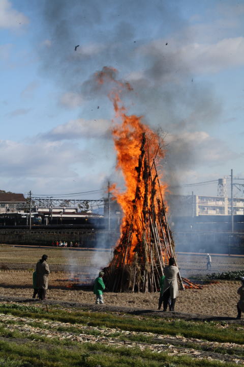 島本竹工房主催、正月のお飾りや書初めなどを、青竹と稲わらで組上げた「どんと」に